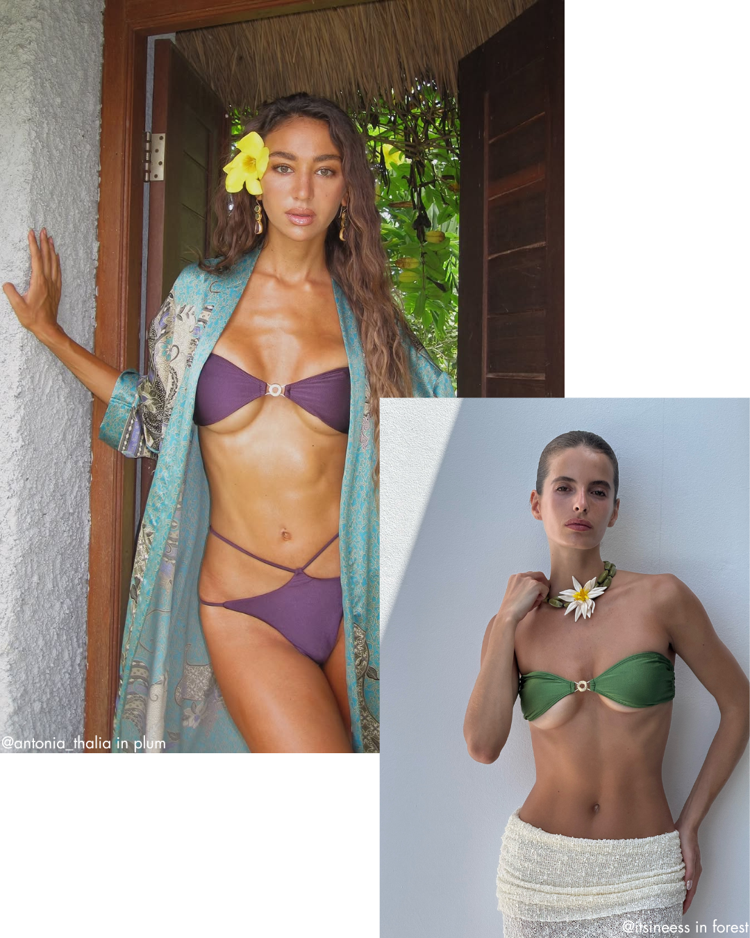 The ultimate shape-shifter. Olympia transforms into eight different looks, while Amy’s double straps and ruched panels shift from cheeky to medium coverage. One set, endless possibilities.