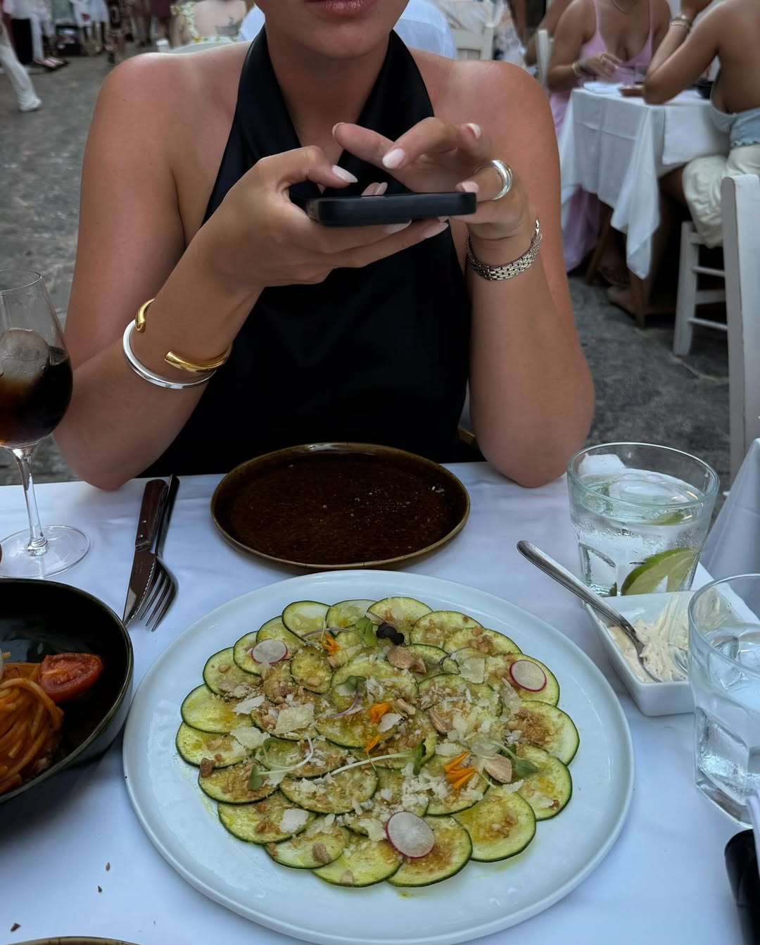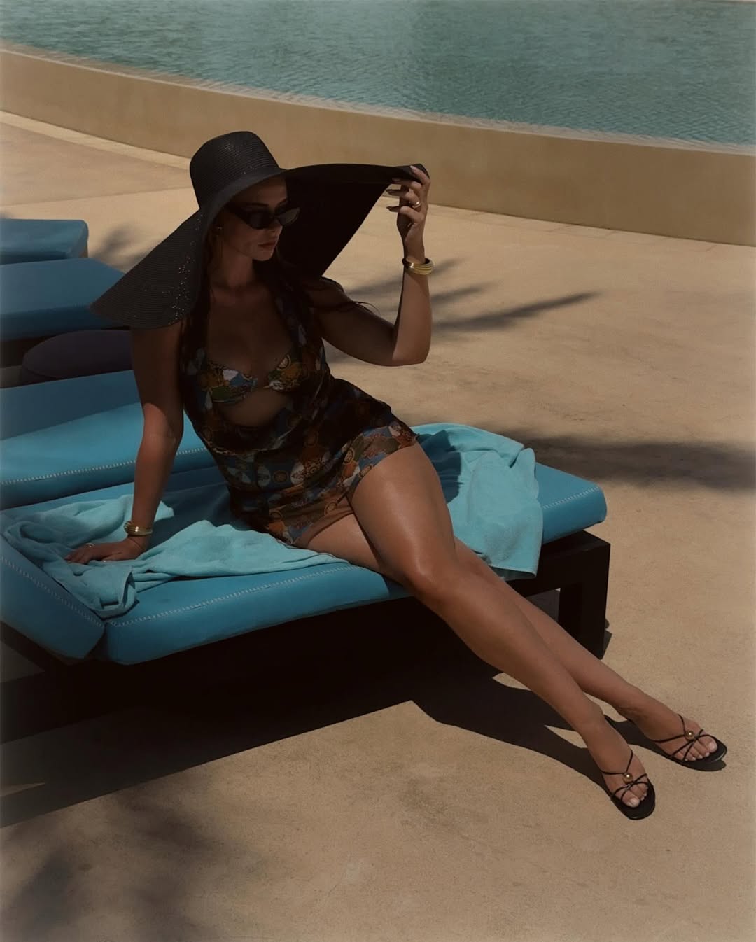 Vivian also styled the look with our matching Arya Dress in Asako, a short, flowy silhouette crafted in semi-sheer fabric, designed to drape elegantly over sun-kissed skin. With its halter neckline, adjustable deep V front, and low back, this dress delivers just the right balance of allure and ease, ideal for transitioning from poolside moments to late-afternoon aperitifs.