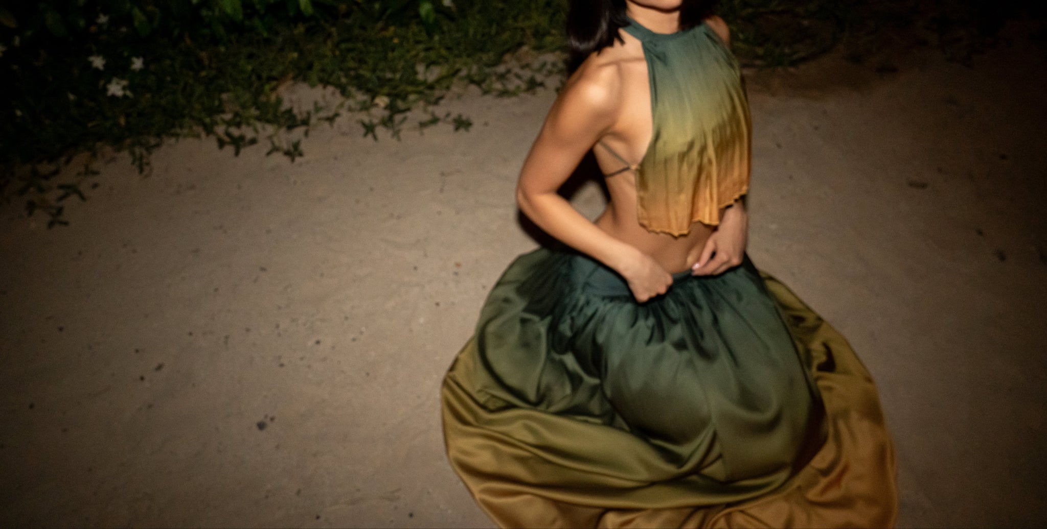 Deep greens that slip into softer notes, this is Eden at its most alive. The Noor Top sculpts with a defined, flattering fit, while the Tess Skirt floats with ease. Together, they create balance: sharp lines softened by movement, perfect for days by the sea or nights that never end.
