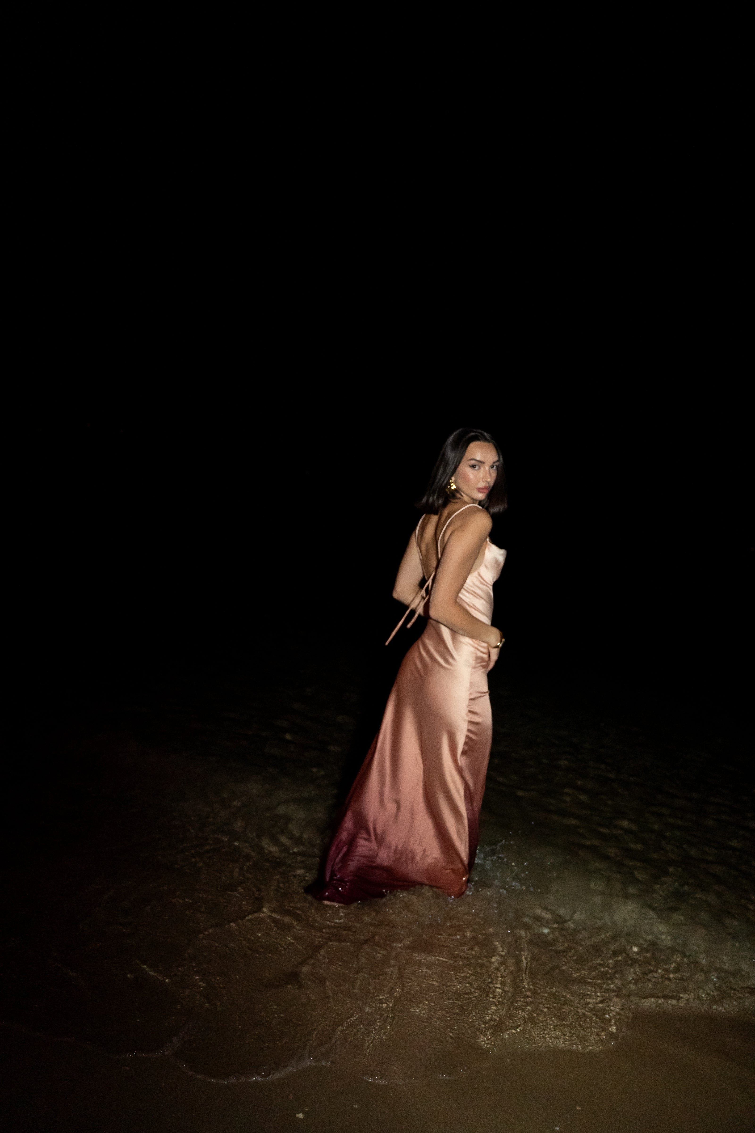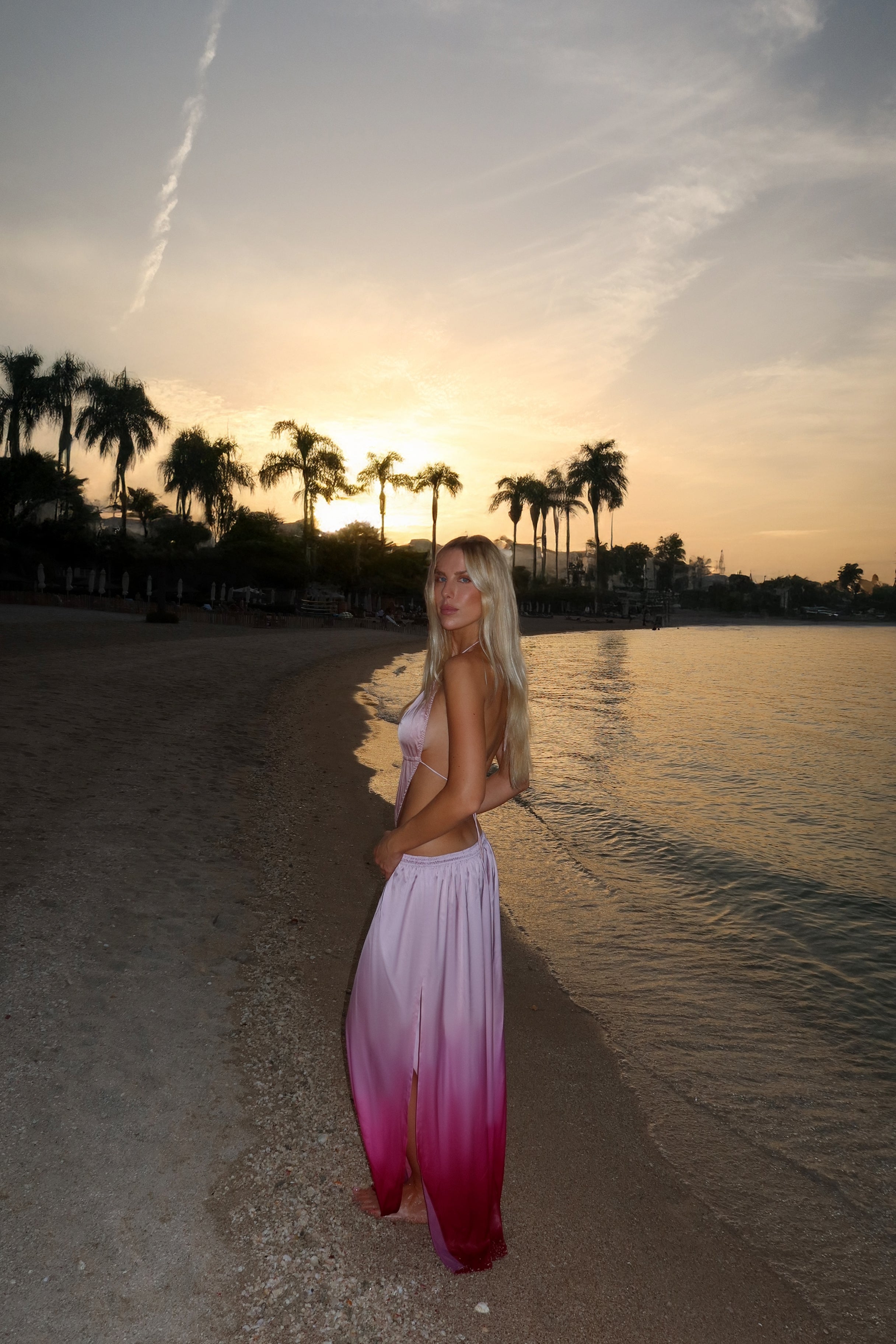 Beige melting into coral, kissed by hints of firelight. The Iman Dress feels like standing at the edge of golden hour, where heat lingers long after the sun dips. A full-length silhouette that demands simplicity in styling: strappy sandals, bronzed skin and nothing more.